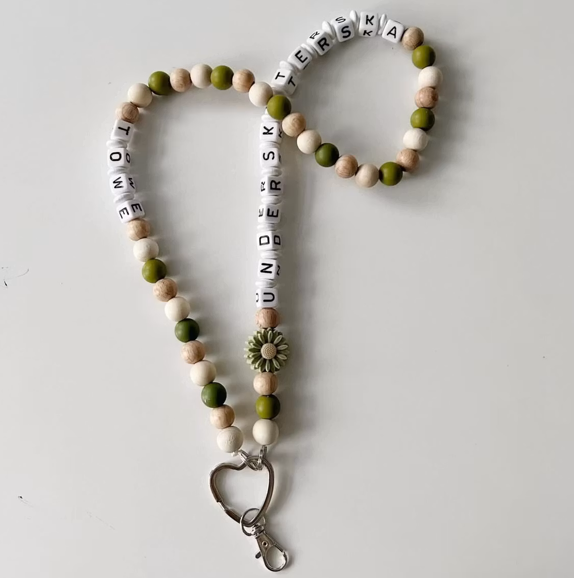 Skötsel: Det går bra att torka av kedjan med ytdesinfektion eller torka av med fuktig trasa. Tänk på att träpärlor är av naturträ och lacken kan därmed ge avnötning efter en tids användning.