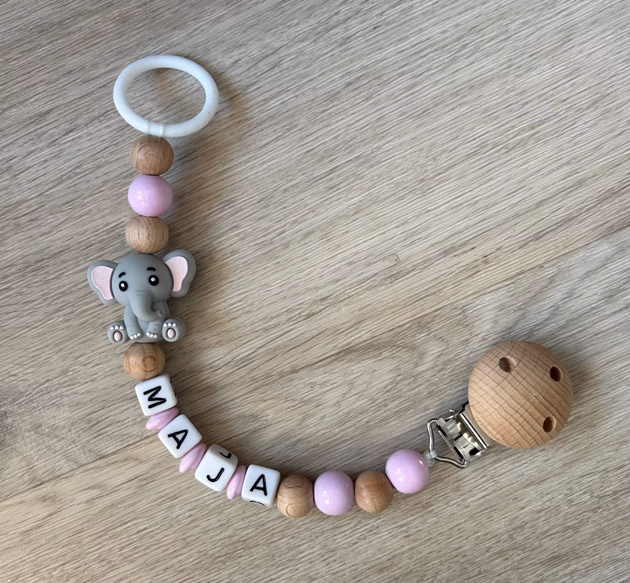 Färgpärlorna är av träpärlor som uppfyller kraven enligt DIN EN 71-3 och EN 71-9. Bokstavspärlorna är av akryl.