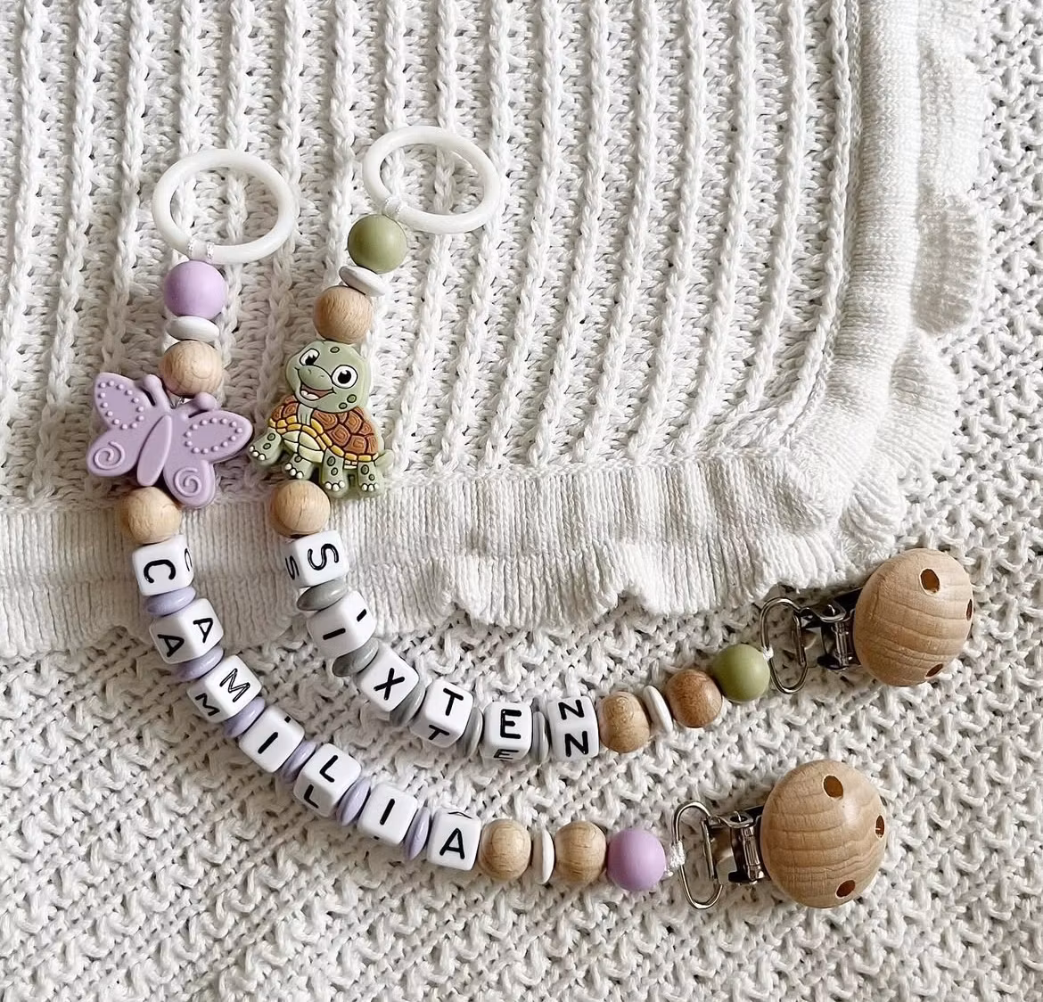 Färgpärlorna är av träpärlor som uppfyller kraven enligt DIN EN 71-3 och EN 71-9. Bokstavspärlorna är av akryl.