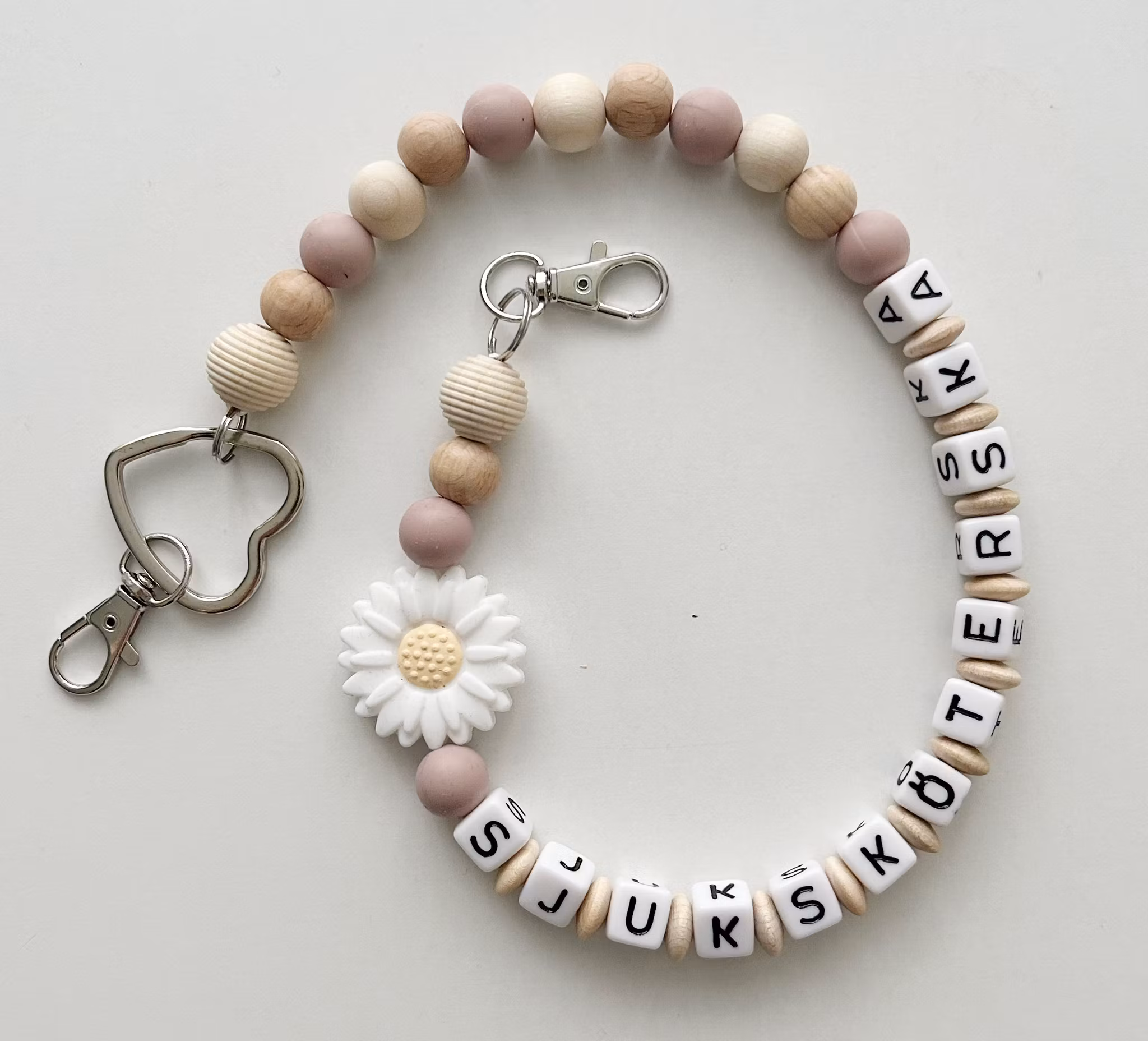 Skötsel: Det går bra att torka av kedjan med ytdesinfektion eller torka av med fuktig trasa. Tänk på att träpärlor är av naturträ och lacken kan därmed ge avnötning efter en tids användning.