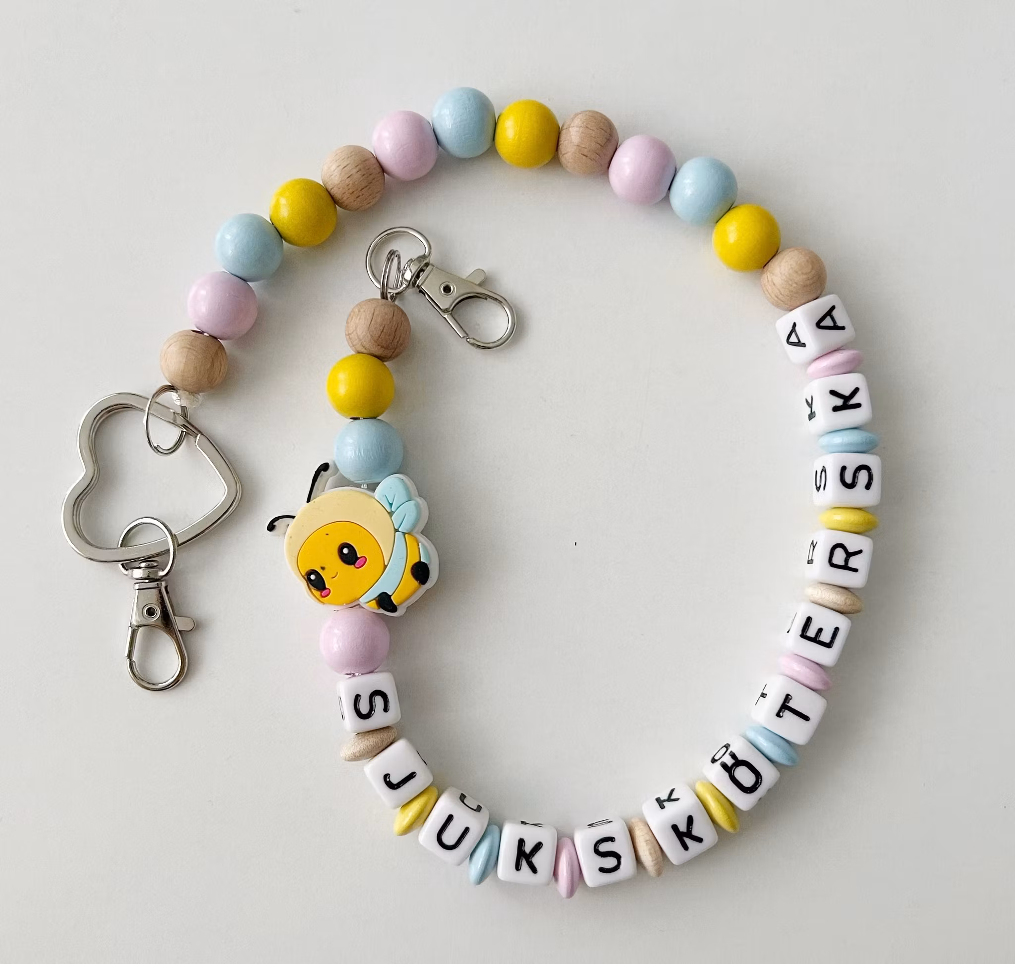 Valfri text ingår men tänk på att utseendet kan påverkas med anledning av kortare/längre text. Tex. vid längre text blir det mindre färgpärlor. Max 20 bokstäver i en kedja är att rekommendera. Om önskemål för längre text rekommenderas istället halsbandskedja.