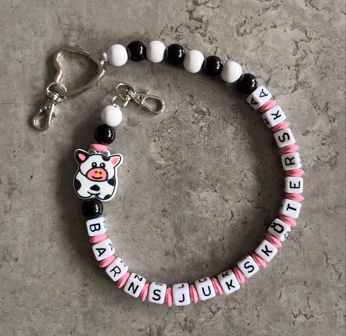 Valfri text ingår men tänk på att utseendet kan påverkas med anledning av kortare/längre text. Tex. vid längre text blir det mindre färgpärlor. Max 20 bokstäver i en kedja är att rekommendera. Om önskemål för längre text rekommenderas istället halsbandskedja.