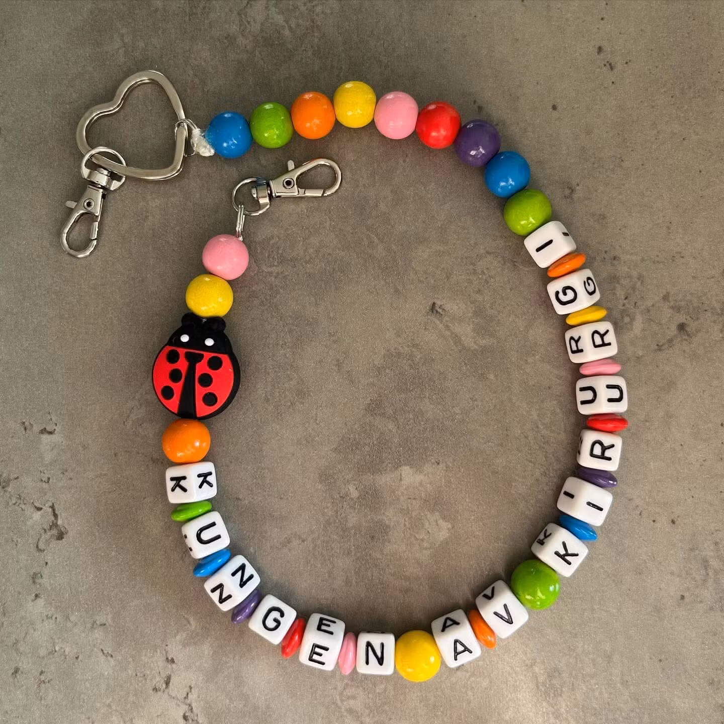 Valfri text ingår men tänk på att utseendet kan påverkas med anledning av kortare/längre text. Tex. vid längre text blir det mindre färgpärlor. Max 20 bokstäver i en kedja är att rekommendera. Om önskemål för längre text rekommenderas istället halsbandskedja.
